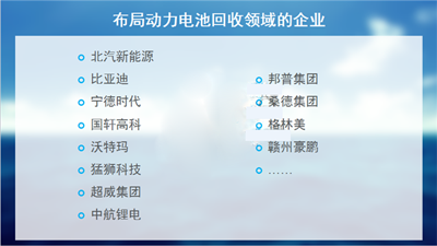 在動(dòng)力電池回收方面,新能源車企與動(dòng)力電池生產(chǎn)企業(yè)責(zé)無旁貸,而一些新能源車企、動(dòng)力電池生產(chǎn)商也在加緊布局回收領(lǐng)域。北汽新能源在廢舊鋰離子動(dòng)力電池回收方面擁有示范線;比亞迪則通過授權(quán)經(jīng)銷商的方式對(duì)廢舊動(dòng)力電池進(jìn)行回收;寧德時(shí)代建設(shè)有動(dòng)力電池回收體系,與宇通、上汽、北汽、吉利等車企進(jìn)行合作;國(guó)軒高科建立電池拆解資源回收中試線;猛獅科技計(jì)劃將正在建設(shè)、完善的全國(guó)連鎖服務(wù)體系投入到廢舊電池回收和梯次利用當(dāng)中;沃特瑪則于2012年建成一座磷酸鐵鋰電池儲(chǔ)能電站,以探索動(dòng)力電池二次利用路線及方法;超威集團(tuán)同研究機(jī)構(gòu)和高校開展合作,攻關(guān)鋰電池回收技術(shù)難題;中航鋰電在動(dòng)力電池方面也是通過建立動(dòng)力電池回收示范線來研究回收。