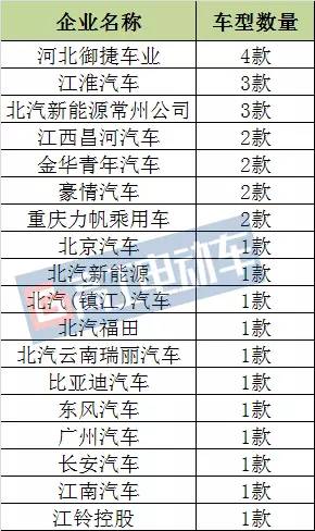 從上榜車型數(shù)量來看,本批目錄中共有18家乘用車企業(yè)上榜,其中,河北御捷車業(yè)上榜車型數(shù)量最多,有4款;其次是江淮汽車和北汽新能源常州公司,車型數(shù)量均為3款;另外,江西昌河汽車、青年汽車、豪情汽車、力帆乘用車均上榜了2款車型;其余的11家乘用車企業(yè)均僅上榜了1款車型。