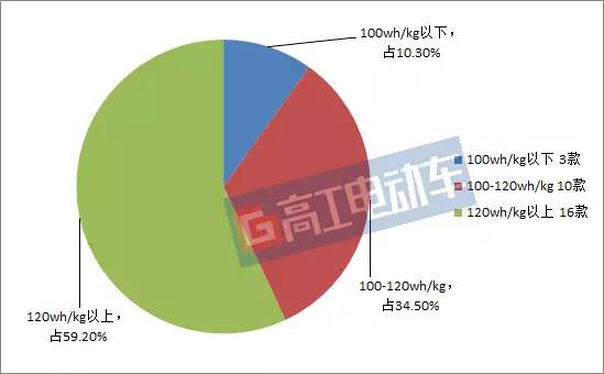 而從電池能量密度方面來看,絕大部分車型的續(xù)航里程均在150KM以上,且大多數(shù)車型的電池系統(tǒng)能量密度高于100wh/kg,占比高達89.66%。其中,有16款車型的電池系統(tǒng)能量密度達到120wh/kg以上,占總數(shù)量的59.17%,可獲得1.1倍補貼,大部分為三元電池。而電池系統(tǒng)能量密度在100wh/kg以下的車型僅有3款。