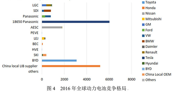 目前全球動(dòng)力電池配套的配套供應(yīng)商主要集中于日、韓、中三國(guó),2016年鋰動(dòng)力電池競(jìng)爭(zhēng)格局為:日系、韓系新能源汽車(chē)配套日韓主機(jī)廠控股或合資合作的動(dòng)力電池企業(yè)產(chǎn)品;美系新能源汽車(chē)配套日韓動(dòng)力電池企業(yè)產(chǎn)品,其中特斯拉正在籌建自己的超級(jí)動(dòng)力電池工廠;歐系新能源汽車(chē)配套日、韓、中三國(guó)領(lǐng)先的動(dòng)力電池企業(yè)產(chǎn)品。這些整車(chē)廠的純電動(dòng)與插電式混動(dòng)汽車(chē)都至少選擇了2~3家動(dòng)力電池供應(yīng)商。
