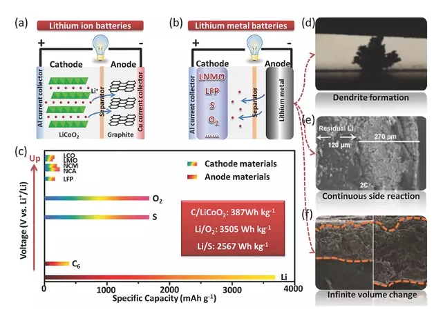 c)典型電極材料在電壓和容量方面的比較,LMBs的能量密度遠(yuǎn)大于LIBs;