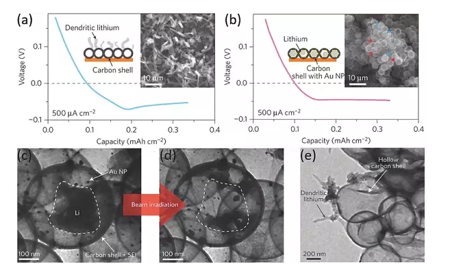 c-e)鋰沉積(c)、原位電子束加熱(d)后具有Au NPs的納米膠囊,鋰沉積后沒(méi)有Au NPs的碳?xì)ぃ╡)的TEM圖像。
