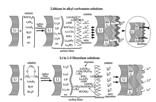 通常,本征SEI層由各種有機(jī)物(低聚物和聚合物)和無(wú)機(jī)物組成,其中有機(jī)部分賦予SEI層柔性以適應(yīng)鋰沉積,而無(wú)機(jī)部分能夠?qū)崿F(xiàn)快速的鋰離子傳輸。然而,無(wú)機(jī)碳酸鋰(Li2CO3)和鋰乙烯碳酸氫鈉(LEDC)作為兩個(gè)主要的SEI組分,在鋰沉積電位附近是熱力學(xué)不穩(wěn)定的,并且允許循環(huán)中反應(yīng)發(fā)生,而氧化鋰(Li2O)是唯一的熱力學(xué)和動(dòng)力學(xué)穩(wěn)定的組分,最里面的SEI層中的Li2O薄層是非常重要的,以避免在沒(méi)有氟化物源的情況下破裂。此外,化學(xué)和物理各向異性在SEI層內(nèi)是常見(jiàn)的,同時(shí)導(dǎo)致異質(zhì)鋰通量和不均勻沉積。沉積和溶解時(shí),由無(wú)機(jī)離子香料組成的表面不能適應(yīng)形態(tài)變化,因此可能會(huì)分解,導(dǎo)致高度不均勻的鋰沉積,使得枝晶形成。迄今為止,選擇合適的溶劑、鋰鹽和添加劑可以有效和高效地調(diào)節(jié)SEI層的性質(zhì)。
