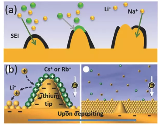 b)自愈式靜電屏蔽機(jī)制。Cs+或Rb+將積聚在尖端附近以形成靜電屏蔽,排斥Li+沉積在負(fù)極附近區(qū)域。
