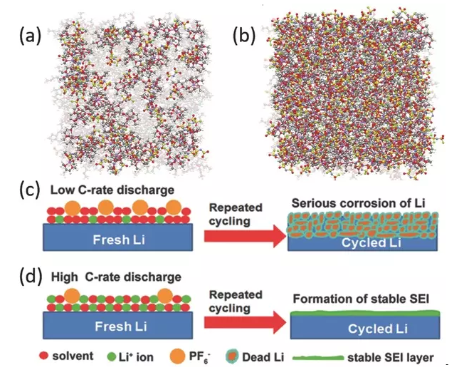 c-d)低速率高速率放電時(shí),鋰金屬負(fù)極上的SEI演變。
