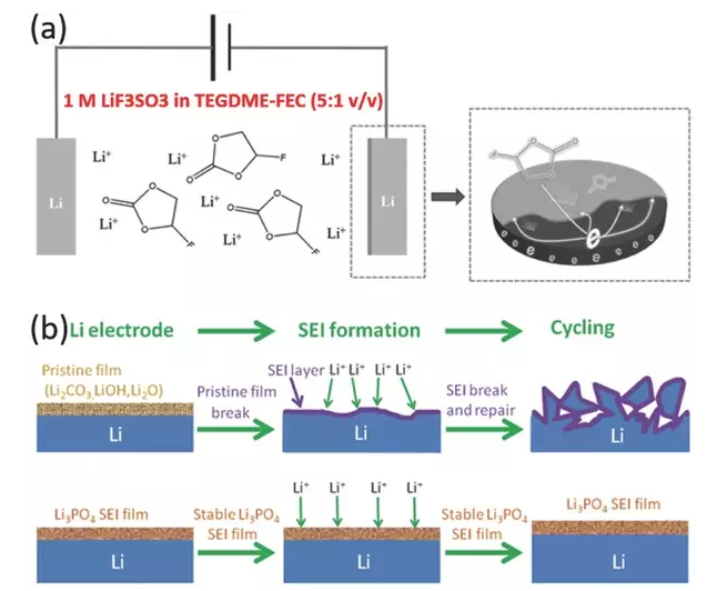 由極性有機(jī)溶劑和鋰鹽組成的LOE是電池的一部分。電解質(zhì)調(diào)節(jié)是促進(jìn)長(zhǎng)期循環(huán)性能和抑制枝晶生長(zhǎng)最有效、最方便的途徑之一。由于其巨大影響和低成本,電解質(zhì)調(diào)節(jié)適合商業(yè)化。電解質(zhì)的組成、添加劑和濃度極大地影響SEI層的性質(zhì)和鋰沉積行為。