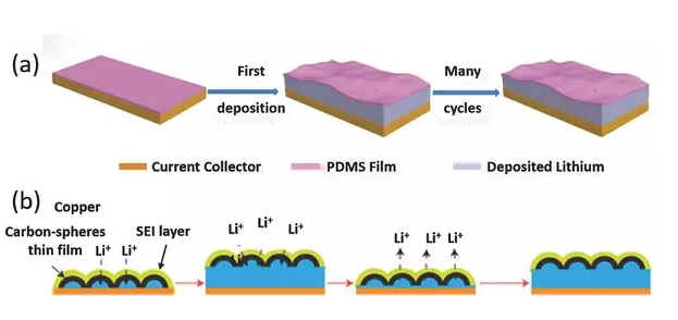 a)在涂覆多孔PDMS薄膜的Cu基底上沉積鋰;