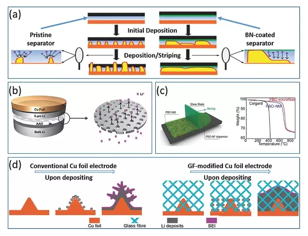 常規(guī)的非織造聚合物或微孔隔膜太脆弱以至于不能抵抗枝晶,對(duì)鋰沉積行為沒(méi)有顯著影響。這里開(kāi)發(fā)了改進(jìn)的中間層,以進(jìn)一步保證電池的性能,這主要是通過(guò)與枝晶或鋰離子通量的相互作用。這里,中間層具有不同的功能,包括專門設(shè)計(jì)的分離器或附加的保護(hù)層,以彌補(bǔ)分離器的弱點(diǎn)。