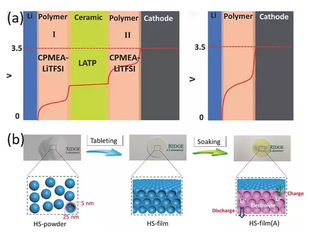 a)聚合物/陶瓷/聚合物-三明治電解質(zhì)(左),內(nèi)部曲線是固體混合電解質(zhì)和單個(gè)固體聚合物電解質(zhì)的電勢(shì)分布圖(右);