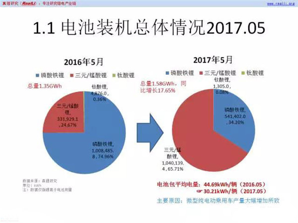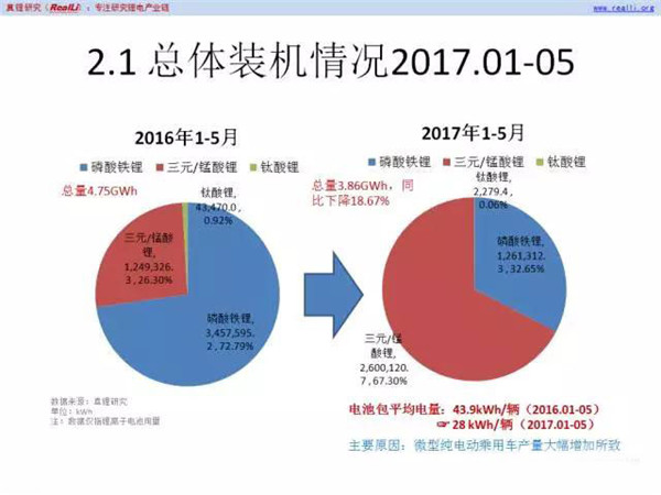 由于前4個(gè)月挖的坑有點(diǎn)大,因此,盡管5月份同比增長,但2017年前5個(gè)月電池裝機(jī)3.86GWh,同比還是下降了18.67%(去年同期4.75GWh)。車輛電池包平均電量28kWh,與去年同期相比有大幅下降,原因同前:①純電動(dòng)客車產(chǎn)量同比大降87.7%;②純電動(dòng)乘用車中微型車數(shù)量大幅增長。