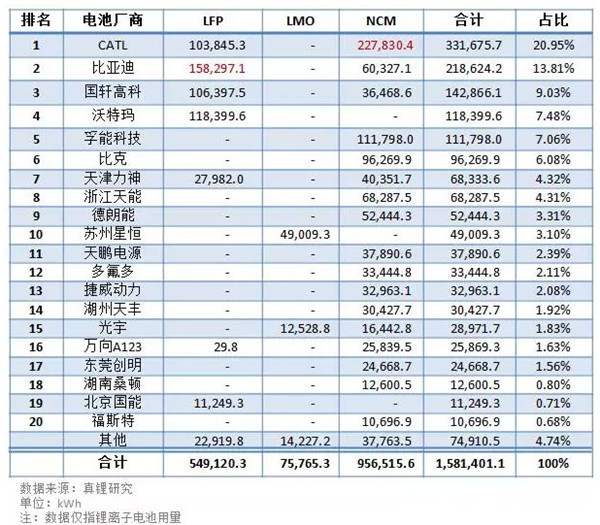 從電池廠商情況看,CATL和比亞迪的供應(yīng)量仍然穩(wěn)居前兩位,分別以331.7MWh和218.6MWh占據(jù)了20.95%和13.81%的市場份額。3-5位依次是國軒高科、沃特瑪和孚能科技,具體見下圖:
