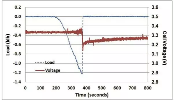 為了方便讀者理解本文,下圖是給出了LFP電池一個非常典型的成功通過機械擠壓測試(正反饋)的判據(jù),電池擠壓變形達到一定的程度后,引起了電池內短路的發(fā)生,電池電壓迅速下降,檢測到電壓下降后(0.1V),擠壓力隨之被移除,電池的電壓快速回升,電池沒有發(fā)生熱失控,則電池通過擠壓實驗。