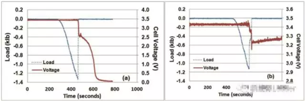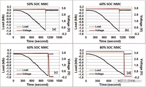 在對25Ah的NMC電池擠壓-扭轉測試中,發(fā)現(xiàn)50%SoC狀態(tài)下的電池都成功通過了測試,如圖a所示,60%SoC狀態(tài)下的電池有三只通過了測試,如圖b所示,另外的三只沒有通過測試,如圖c所示,可見60%SoC的電池通過測試和不通過測試的概率各為50%,而80%SoC的電池則都沒有通過測試,如圖d所示。由此可見,60%SoC是NMC電池安全性的一個分水嶺,低于這個數(shù)值時電池相對是安全的,高于這個數(shù)值,則電池在機械濫用的情況下的安全性將大大下降。