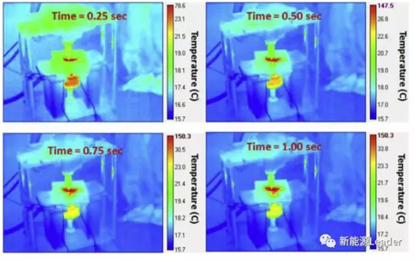 下圖為60%SoC的NMC電池在擠壓-扭轉實驗中的熱成像圖,從圖中可以看到在短路發(fā)生后,短路點的溫度在0.5S內迅速升高到了147.5 ℃,隨后高溫區(qū)域迅速向周圍擴展,說明周圍區(qū)域溫度升高并不是由熱傳導導致的,而是高溫引發(fā)了其他的化學反應。而在80%SoC下,NMC電池發(fā)生熱失控的溫度更高,引起周圍化學反應的速度也更快。