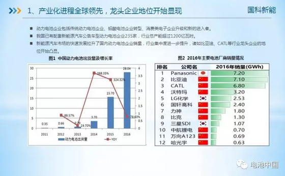 第一,我國動力電池產業(yè)化的進程全球領先,龍頭企業(yè)的地位已經開始顯現。