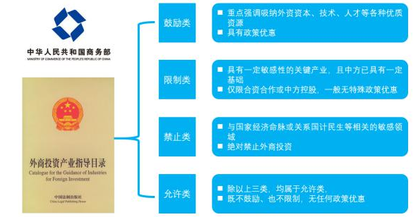 首先我們要看看外商投資目錄的具體分類(lèi)和作用。眾所周知,《外商投資產(chǎn)業(yè)指導(dǎo)目錄》是我國(guó)直接指導(dǎo)核準(zhǔn)外商投資的政策,其將外商投資項(xiàng)目分為鼓勵(lì)類(lèi)、限制類(lèi)、禁止類(lèi)、允許類(lèi)四類(lèi)(項(xiàng)目具體劃分如圖1所示)。簡(jiǎn)單而言,商務(wù)部通過(guò)目錄分類(lèi)管理實(shí)現(xiàn)了外商投資的宏觀管控,是一種兼具計(jì)劃經(jīng)濟(jì)與市場(chǎng)經(jīng)濟(jì)色彩的行政手段。