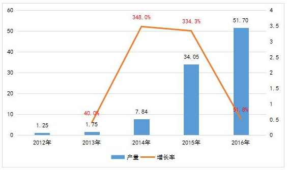 圖3 2012年-2016年我國(guó)新能源汽車(chē)產(chǎn)量及增長(zhǎng)率