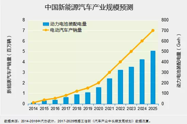 2017年,工業(yè)和信息化部、發(fā)展改革委、科技部共同印發(fā)《汽車產(chǎn)業(yè)中長期發(fā)展規(guī)劃》中指出,到2020年,新能源汽車年產(chǎn)銷達(dá)到200萬輛,到2025年我國新能源汽車銷量占總銷量的比例達(dá)到20%以上。通過折算,碳酸鋰當(dāng)量需要將增加30萬噸,鈷金屬當(dāng)量增加10萬噸。而去年全國碳酸鋰供銷為18-19萬噸,這意味著不到10年時間碳酸鋰需求將增長30萬噸。