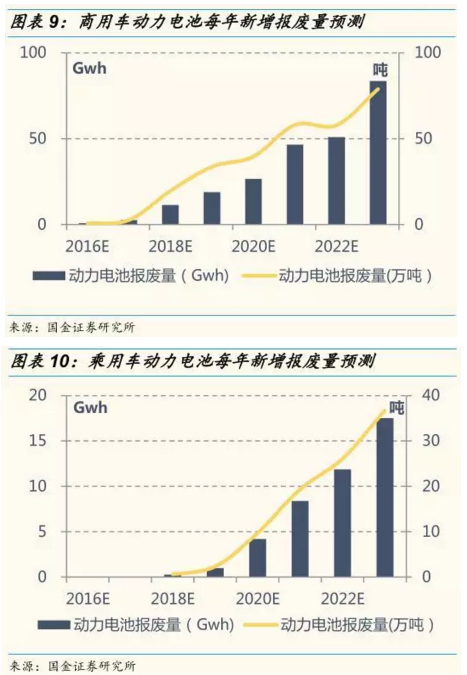 根據(jù)我們的測算,按商用車(按3 年電池壽命假設(shè))和乘用車(5 年)所使用的動力鋰電池報廢量,將在2020年分別達(dá)到27Gwh和4.2Gwh,在2023年分別達(dá)到84Gwh和17.5Gwh