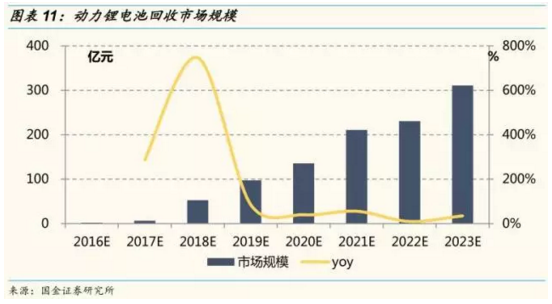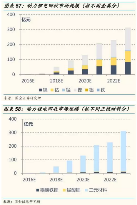 根據(jù)測算,從廢舊動力鋰電池中回收鈷、鎳、錳、鋰及鐵和鋁等金屬所創(chuàng)造的市場規(guī)模將會在 2018 年開始爆發(fā),達(dá)到 52 億元,2020 年達(dá)到136億元,2023 年將超過300 億元。