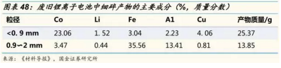 組成鋰離子電池的正極、負(fù)極、隔膜、電解質(zhì)等材料中含有大量的有價金屬。不同動力鋰電池正極材料中所含的有價金屬成分不同,其中潛在價值最高的金屬包括鈷、鋰、鎳等。例如,三元電池中鋰的平均含量為 1.9%、鎳 12.1%、鈷 2.3%;此外,銅部分、鋁部分等占比也達(dá)到了 13.3%和12.7%,如果能得到合理回收利用,將成為創(chuàng)造收入和降低成本的一個主要來源。
