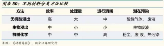 第二步:材料分離。預(yù)處理階段富集得到了正極和負(fù)極的混合電極材料,為了從中分離回收 Co 、Li 等有價金屬,需要對混合電極材料進(jìn)行選擇性提取。材料分離的過程也可以按照干法回收、濕法回收和生物回收的分類技術(shù)分為:(1)無機(jī)酸浸出;(2)生物浸出;(3)機(jī)械化學(xué)浸出。
