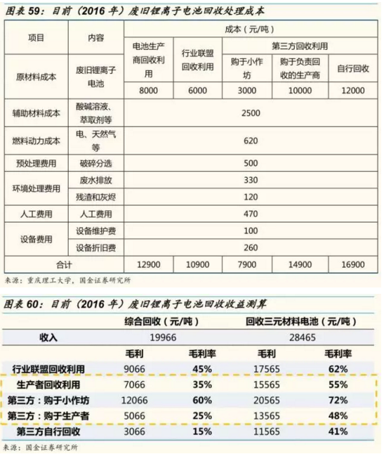 從毛利率 、可行性和可持續(xù)性三方面看, 我們認(rèn)為:電池廠商直接回收利用形成閉環(huán)的模式以及第三方專業(yè)拆解機(jī) 構(gòu)向電池廠商 購買廢舊電池的模式是目前主流的動力鋰電回收模式,且在鋰電綜合回收的情況下具有較好的經(jīng)濟(jì)性。