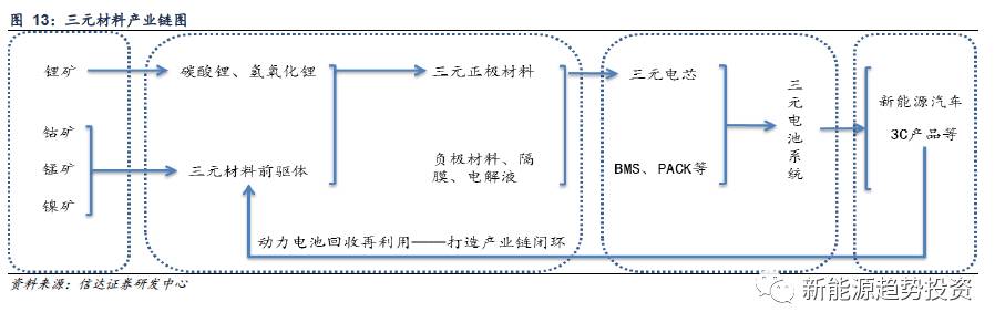 三元電池與其他鋰電池的主要區(qū)別在于正極材料的使用。三元電池以三元材料為正極材料,相應(yīng)的也需要負(fù)極、隔膜和電解液共同配合改進(jìn)來適應(yīng)新的材料體系,以達(dá)到最佳效果。目前業(yè)已形成從上游金屬礦到下游新能源汽車、3C等領(lǐng)域應(yīng)用的完整產(chǎn)業(yè)鏈。