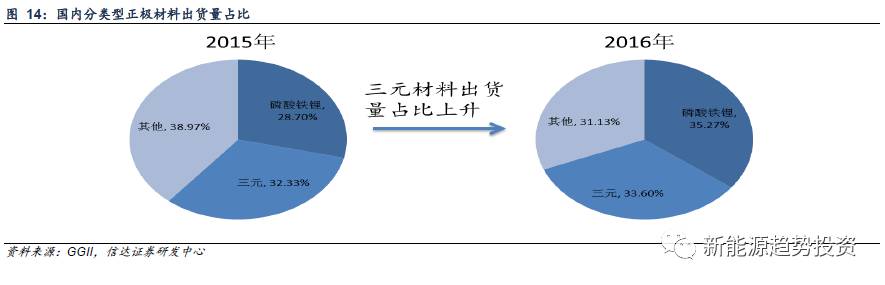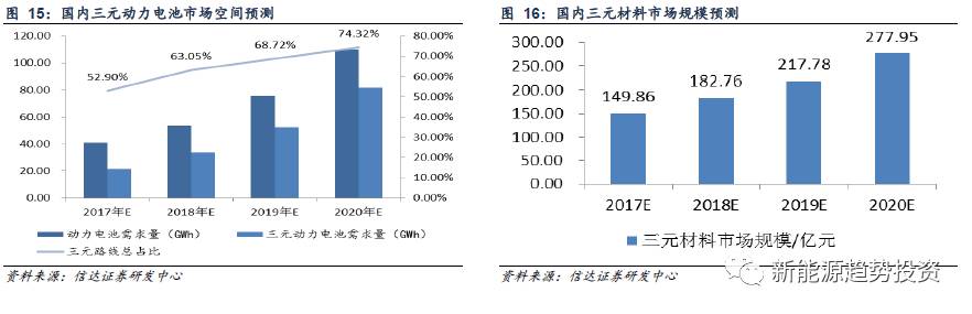 2016年,三元材料出貨量占正極材料出貨量34%,產(chǎn)值達(dá)79.8億元,即使受到客車上禁止配套三元電池政策的影響,其占比仍然有所上升。未來隨著乘用車電動化的趨勢不斷深化,我們認(rèn)為三元材料占比將進(jìn)一步提升。