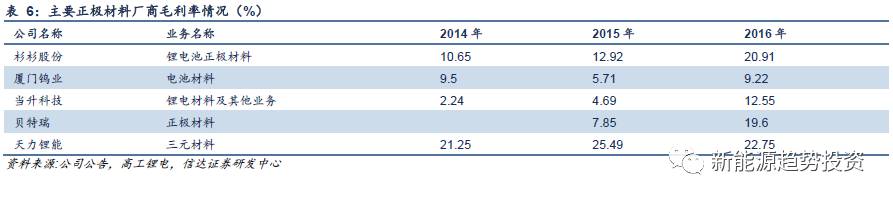 鈷價上漲意味著下游需求的上漲。國內(nèi)正極材料廠商主要采取加成定價模式,在原材料成本的基礎(chǔ)上增加利潤與加工費,目前正極材料產(chǎn)品整體的毛利率在10%左右。正極材料廠商有著較為穩(wěn)健的成本上升的傳導(dǎo)機(jī)制,注意到鈷價穩(wěn)定上漲意味著產(chǎn)業(yè)鏈需求較好,會利好成本加成型行業(yè),隨著鈷價上漲企業(yè)毛利率有上揚態(tài)勢:2015年與2016年三元電池需求上漲,三元材料廠商毛利率總體來看呈上升趨勢。但是也要關(guān)注原材料價格走高會一定程度上壓縮產(chǎn)業(yè)鏈利潤。