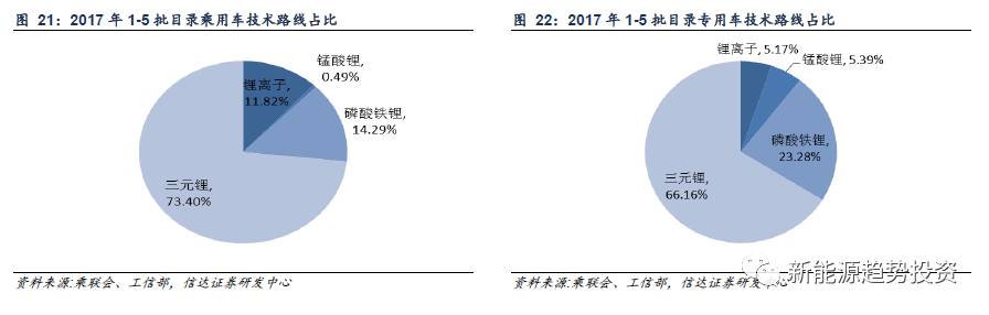 三元占比突出,尤以乘用車和專用車為甚?!缎履茉雌囃茝V應(yīng)用推薦車型目錄》(2017年第5批)中乘用車和專用車三元占比十分突出,乘用車占比更是達(dá)到75%以上。綜合看2017年1-5批目錄,26%的車型搭載三元鋰電池,乘用車與專用車三元占比均在70%左右。