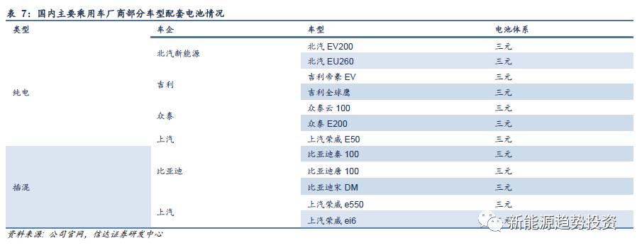 目前已有多家國內(nèi)主要汽車廠商為不同車型配套三元電池,三元的應(yīng)用越來越廣闊。