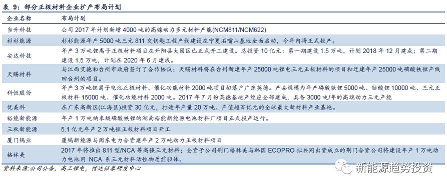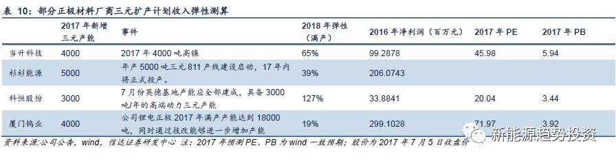 我們對部分正極材料公司2017年三元材料擴(kuò)產(chǎn)情況進(jìn)行了收入彈性測算,可以看到,到2018年,各個企業(yè)擴(kuò)產(chǎn)計劃對該企業(yè)凈利有著顯著的正影響。