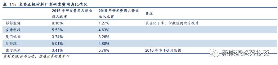 由于三元材料、尤其是高鎳三元材料技術(shù)壁壘較高,各個正極材料廠商紛紛加大研發(fā)投入,努力搶占技術(shù)高地。2016年,企業(yè)研發(fā)占比多有所提升。