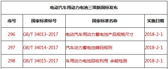 本次GB/T 34013-2017《電動汽車用動力蓄電池產品規(guī)格尺寸》、GB/T 34014-2017《汽車動力蓄電池編碼規(guī)則》、GB/T 34015-2017《車用動力電池回收利用 余能檢測》三項國家標準發(fā)布,使動力電池產品規(guī)格尺寸、編碼規(guī)則和回收利用余能檢測有標準可依,對動力電池行業(yè)規(guī)范發(fā)展具有重要意義,對動力電池企業(yè)乃至新能源汽車產業(yè)都將產生影響。