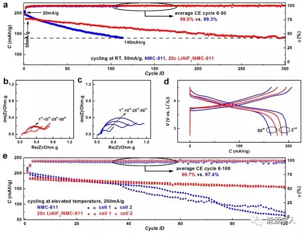 作者將LiAlF4薄膜直接沉積在極片上,而不是在每個(gè)顆粒表面。滿足了在寬電化學(xué)窗口下工作的要求。作者研究了在2.75-4.50V下,高Ni含量LiNi0.8Mn0.1Co0.1O2(NMC-811)上沉積的涂層效果。在室溫下,具有LiAlF4涂層的NMC-811電極在300次循環(huán)后維持高于140mAh/g的容量(超過300次循環(huán)衰減24%,每循環(huán)0.08%)。對(duì)于原始的NMC-811,113次循環(huán)后容量下降到低于140mAh/g(在113個(gè)循環(huán)中衰減29%,每個(gè)循環(huán)為0.26%)。由于高溫下的循環(huán)穩(wěn)定性差是高Ni含量層狀鋰金屬氧化物最為顯著的缺點(diǎn)。因此,作者對(duì)樣品進(jìn)行了高溫環(huán)境(50℃)的電化學(xué)測(cè)試。由于在50℃下涂層和NMC-811本身的鋰離子傳導(dǎo)性都會(huì)提高,所以以20c的倍率測(cè)試。原始NMC-811電極的容量在100個(gè)循環(huán)內(nèi)快速衰減低于100 mAh/g。相比之下,具有ALD LiAlF4涂層的NMC-811電極在100個(gè)循環(huán)內(nèi)顯示出優(yōu)異的容量保持率。