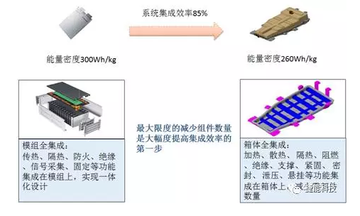 按照電芯能量密度300Wh/kg和Pack能量密度260Wh/kg的目標(biāo)來(lái)計(jì)算,Pack系統(tǒng)的集成效率要做到85%,而當(dāng)前乘用車(chē)Pack的集成效率普遍在65%左右,這意味著集成效率需要大幅度提升,才能達(dá)成目標(biāo)。