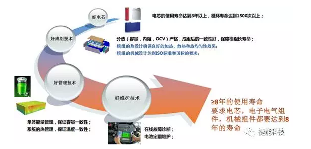 要達(dá)到如此嚴(yán)格的壽命要求,除了電芯的循環(huán)壽命和日歷壽命要達(dá)到目標(biāo),還需要電子、電氣、機(jī)械組件也達(dá)到8年以上的使用壽命。除此之外,在電芯的成組技術(shù)、系統(tǒng)的熱管理和能量管理、以及Pack的售后維護(hù)等方面,也都有非常高的要求。