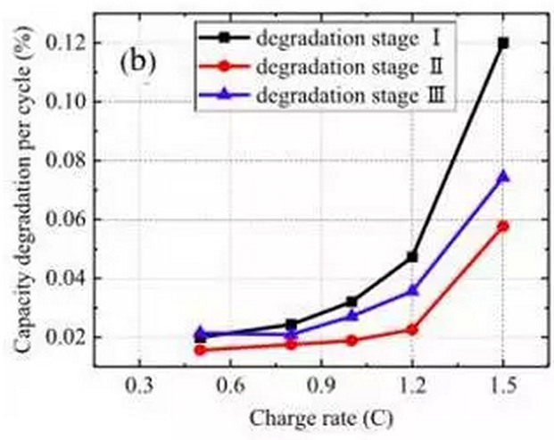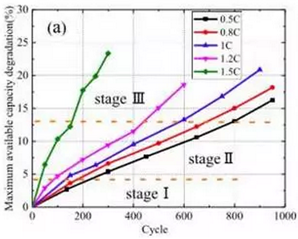 從數(shù)據(jù)可以看到,隨著充電的倍率的加大,鋰離子電池的衰降速率也在快速增加,并且從曲線的斜率來(lái)看,電池的衰降速度存在三個(gè)不同的階段,前期衰降速度較快的階段(階段1),中間衰降速度較慢的穩(wěn)定階段(階段2),和后期的衰降速率加速階段(階段3)。