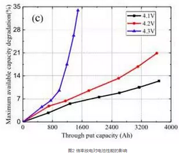 研究試驗(yàn)表明,當(dāng)充電電流和截止電壓超過(guò)一定的數(shù)值時(shí),鋰離子電池的衰降將被極大的加速,為了降低鋰離子電池的衰降速率,需要針對(duì)不同的體系,需要選擇合適的充放電電流和截止電壓。