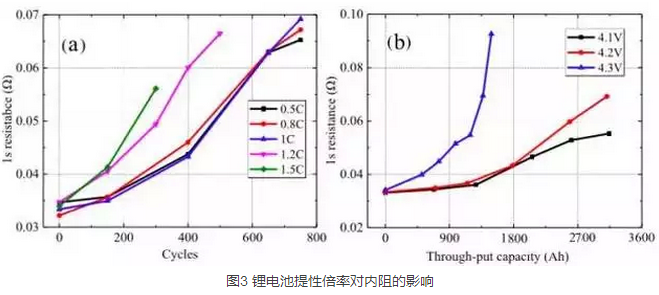 從圖b的測(cè)試結(jié)果來(lái)看,當(dāng)充電截止電壓為4.3V時(shí),電池動(dòng)態(tài)內(nèi)阻增加非常迅速表明高截止電壓會(huì)惡化電池的動(dòng)力學(xué)條件,截止電壓為4.1V和4.2V時(shí)電池動(dòng)態(tài)內(nèi)阻增加較為緩慢。
