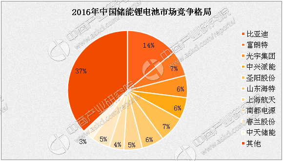 中商產(chǎn)業(yè)研究院《2017-2022年中國鋰電池市場調(diào)研及預(yù)測報(bào)告》顯示,2016年中國儲(chǔ)能鋰電池市場規(guī)模約52億元。其中,儲(chǔ)能電池市場占比最大的是比亞迪,為14%;其次是富朗特及圣陽股份,均為7%。