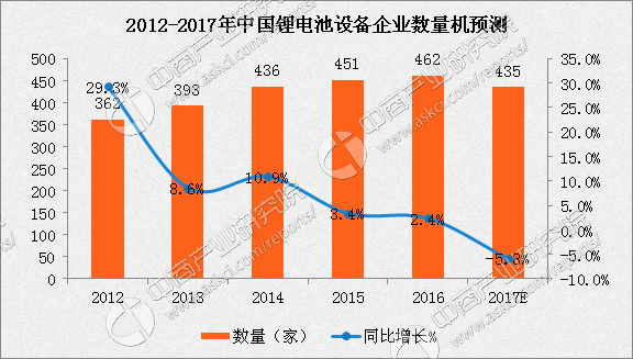 2016年我國鋰電池設(shè)備企業(yè)462價(jià),同比增長2.4%,隨著鋰電池設(shè)備企業(yè)數(shù)量增長逐年下滑,中商產(chǎn)業(yè)研究院預(yù)計(jì)2017年中國鋰電池設(shè)備企業(yè)約435家。