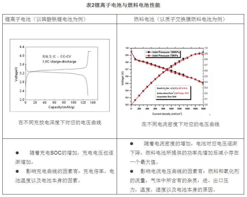 的大小由反應(yīng)本身的性質(zhì)、反應(yīng)物和生成物的濃度以及反應(yīng)溫度決定。n為每摩爾反應(yīng)物轉(zhuǎn)移的電子摩爾數(shù),F(xiàn)為法拉第常數(shù)。在標(biāo)準(zhǔn)狀態(tài)下燃料電池的可逆電動(dòng)勢(shì)為1.25V左右,可逆電動(dòng)勢(shì)隨溫度升高而降低。而對(duì)于鋰離子電池,由于在反應(yīng)過程中正負(fù)極材料的結(jié)構(gòu)不斷發(fā)生變化,因此其可逆電動(dòng)勢(shì)也不斷變化,電池的可逆電動(dòng)勢(shì)與反應(yīng)發(fā)生的程度有對(duì)應(yīng)的關(guān)系,因此可以根據(jù)OCV-SOC曲線,通過測(cè)量OCV判斷電池的荷電狀態(tài)。燃料電池和鋰離子電池在實(shí)際使用過程中性能曲線如表2所示。