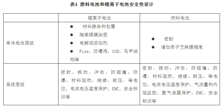 單體層級(jí)燃料電池的安全設(shè)計(jì)少于鋰離子電池。系統(tǒng)集成層級(jí)燃料電池系統(tǒng)比鋰離子電池系統(tǒng)復(fù)雜。由于使用了可燃?xì)怏w氫氣,多了對(duì)氫氣的泄露保護(hù)設(shè)計(jì)。由于需要防止質(zhì)子交換膜潤(rùn)濕不充分帶來的影響,需要通過監(jiān)控內(nèi)阻來監(jiān)控內(nèi)部濕度的變化。燃料電池和鋰離子電池相關(guān)安全性設(shè)計(jì)如表4所示。