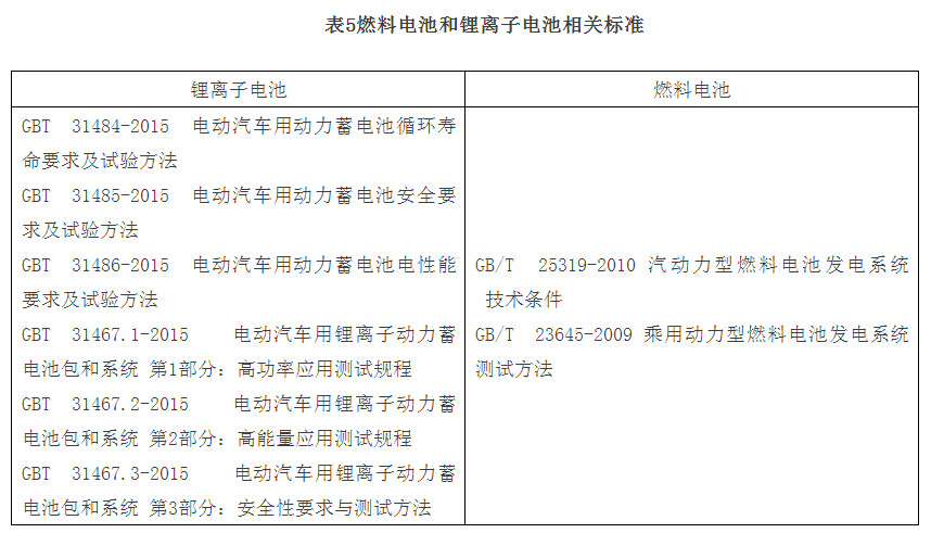 為了保證動(dòng)力電池的安全性,國家針對(duì)動(dòng)力型鋰離子電池和燃料電池制定了一系列的標(biāo)準(zhǔn),從而確保動(dòng)力電池的安全性、可靠性。如表5所示,燃料電池相對(duì)鋰離子電池的標(biāo)準(zhǔn)偏少,發(fā)行時(shí)間早,標(biāo)準(zhǔn)與現(xiàn)狀符合性不如鋰離子電池。電動(dòng)汽車有對(duì)應(yīng)的定型試驗(yàn)規(guī)程《GB/T18388—2005電動(dòng)汽車定型試驗(yàn)規(guī)程》,而燃料電池車定型規(guī)程作為汽車行業(yè)對(duì)于新能源汽車產(chǎn)品定型的一個(gè)必備標(biāo)準(zhǔn)急待推出。