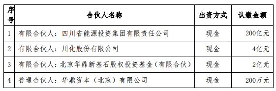據(jù)了解,華鼎新動(dòng)力采取有限合伙制形式,出資采取認(rèn)繳制,根據(jù)投資項(xiàng)目進(jìn)度分批實(shí)繳出資。川化股份本次對(duì)其新增認(rèn)繳出資4億元后,華鼎新動(dòng)力的總認(rèn)繳出資額從202.02 億元增加到 206.02 億元人民幣,更新后的各方具體認(rèn)繳出資金額如下: