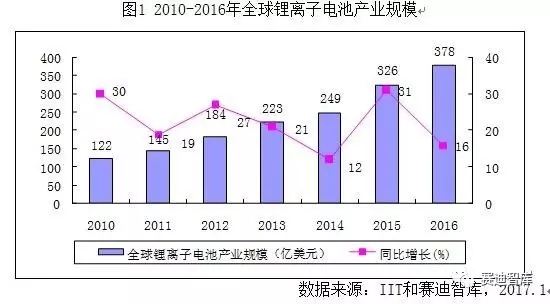 2016年,全球鋰離子電池產(chǎn)業(yè)規(guī)模預(yù)計(jì)達(dá)到378億美元,同比增長(zhǎng)16%,增速較2015年下滑了15個(gè)百分點(diǎn),原因主要在于全球電動(dòng)汽車市場(chǎng)增速明顯下滑。