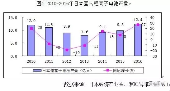 在全球電動(dòng)汽車熱銷的帶動(dòng)下,以松下、湯淺等為代表的日本鋰離子電池生產(chǎn)企業(yè)繼續(xù)向動(dòng)力電池轉(zhuǎn)型,帶動(dòng)日本鋰離子電池產(chǎn)業(yè)呈現(xiàn)加速增長(zhǎng)勢(shì)頭。根據(jù)日本經(jīng)濟(jì)產(chǎn)業(yè)省的統(tǒng)計(jì)數(shù)據(jù)顯示,2016年日本國(guó)內(nèi)鋰離子電池產(chǎn)量達(dá)到12.4億只,創(chuàng)2010年以來(lái)的新高,同比2015年增長(zhǎng)了27%。其中,動(dòng)力型鋰離子電池產(chǎn)量占比已經(jīng)接近2/3,創(chuàng)歷年來(lái)新高。從產(chǎn)值看,2016年日本國(guó)內(nèi)鋰離子電池行業(yè)銷售產(chǎn)值達(dá)到3799億日元(約230億元人民幣),同比增長(zhǎng)11%。