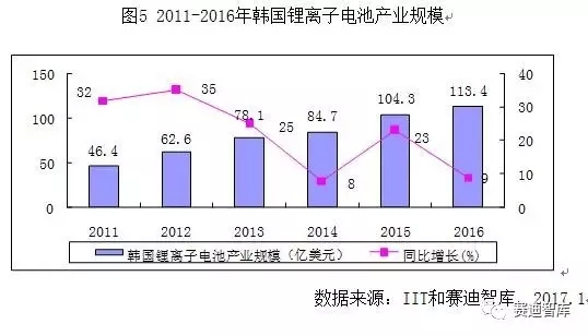 在經(jīng)歷了2015年的快速增長(zhǎng)之后,2016年韓國(guó)鋰離子電池產(chǎn)業(yè)保持穩(wěn)步增長(zhǎng),產(chǎn)業(yè)規(guī)模達(dá)到113.3億美元,同比增長(zhǎng)9%,增速比2015年下滑14個(gè)百分點(diǎn)。主要原因在于兩方面:一是受Galaxy Note7“爆炸門”影響,三星SDI小型電池銷量出現(xiàn)顯著下滑,二是中國(guó)新能源汽車補(bǔ)貼政策調(diào)整,韓系動(dòng)力電池產(chǎn)品未進(jìn)入《汽車動(dòng)力蓄電池行業(yè)規(guī)范條件》目錄,缺乏中國(guó)市場(chǎng)支撐,三星SDI和LG Chem的動(dòng)力電池銷量增長(zhǎng)速度明顯低于預(yù)期。